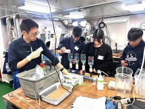実習は2月25日から3月4日までの期間で行われ、学生たちは実際の海洋観測で使用される観測機器の操作方法、溶存酸素およびクロロフィルaの測定方法、船上生活の基本的な規則などを学びました。